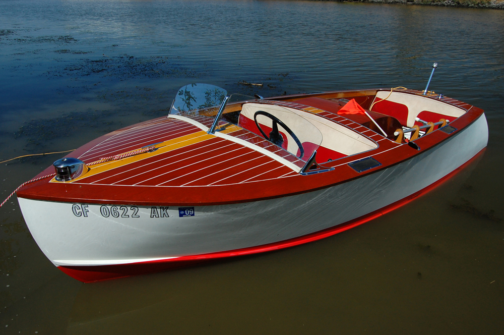 1955 16' Mercury Sabre: Introduced in 1954 the Sabre was Mercury of Burbank California fastest boat with speeds of 40+ mph. The boat was very popular with families at the time who wanted an affordable boat for water skiing. This boat was purchased at the 1955 Oakland California Boat Show; it was the demonstrator. She was acquired from the original owner after sitting in the weather for 30 years. She won first in the utility class at the Tahoe Concours D'Elegance 2011 with a 97.25 out of 100 points